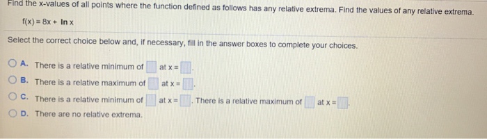 Solved: Find The Location And Value Of All Relative Extrem ... from d2vlcm61l7u1fs.cloudfront.net That is, x=amust be a critical point of f(x). Finding all critical points and all points where is undefined. We are going to start looking at trying to find minimums and maximums of functions. Because of this fact we know that if we have all the critical points of a function then we also have every possible relative extrema for the function. Here is a graph of the function. Absolute extrema are the largest and smallest the function will ever be and these four points represent the only places in the interval where the absolute extrema can occur. Likewise, a relative maximum only says that around (a,b)(a,b) the function will always be smaller than f(a,b)f(a,b). Remember however, that it will be completely possible that at least one of the critical points wont be a relative extrema.